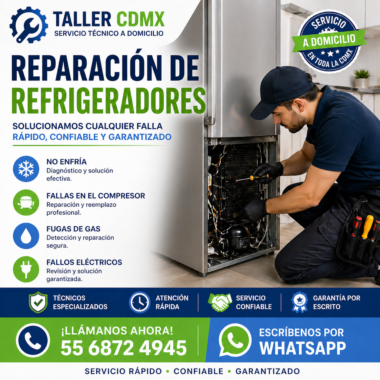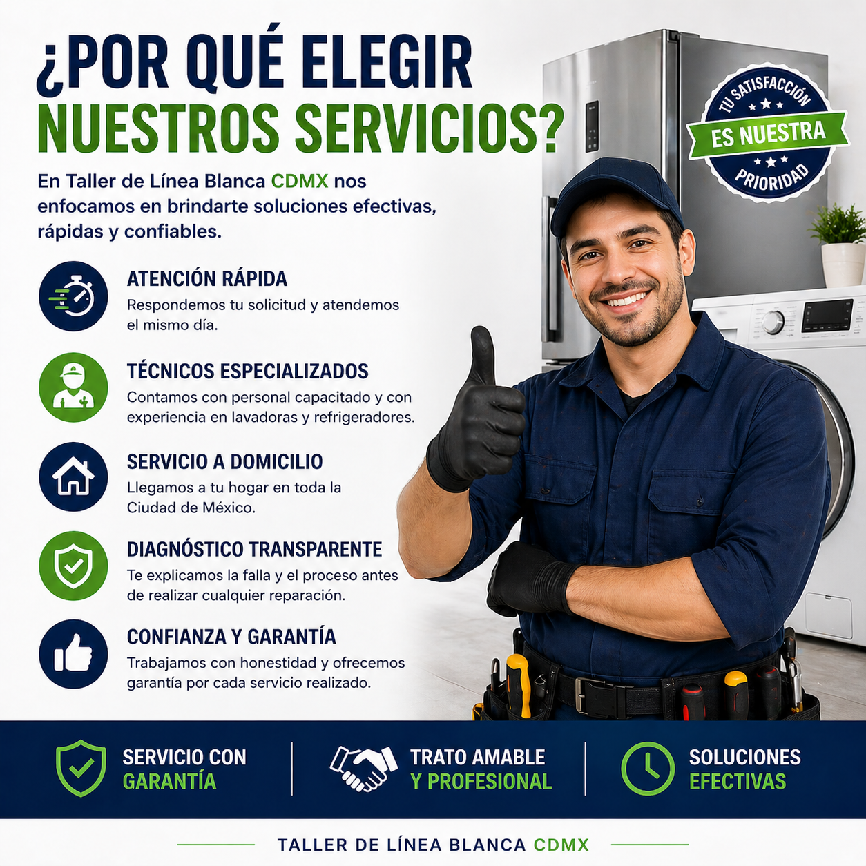 Atención el mismo día, Servicio a domicilio en CDMX, Técnicos con experiencia, Diagnóstico rápido, Atención confiable.